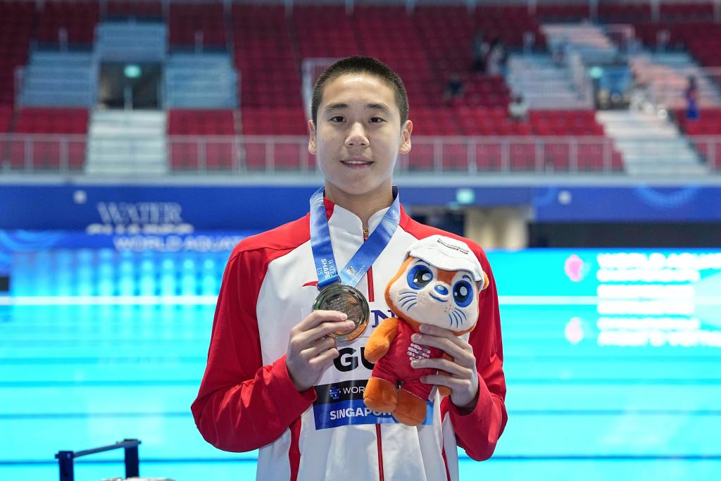 7月21日,郭牧也在2025年国际游水锦标赛花样游水男人单人自在自选颁奖仪式后。新华社记者 薛宇舸 摄
